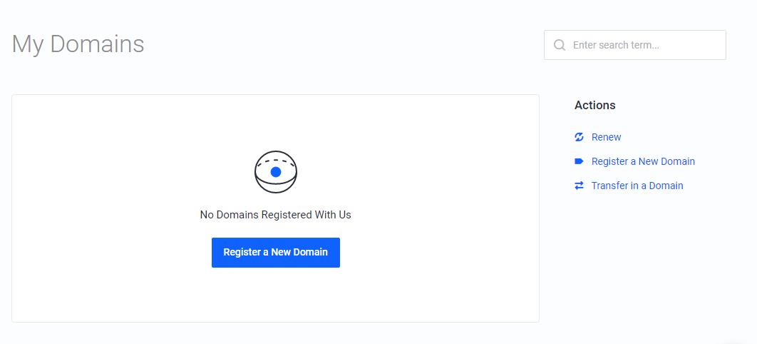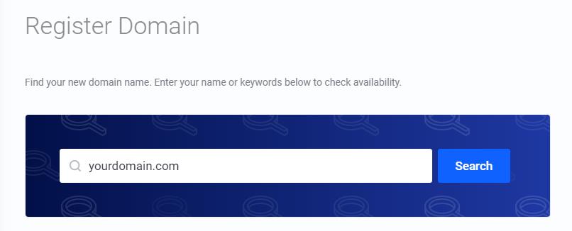 To register a new domain, go to My Domains on Client Panel and click Register a New Domain button. Find a new domain name by typing a domain or keyword in the search field.