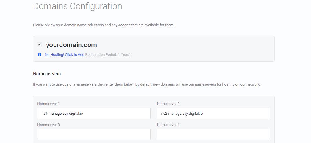 Once you have chosen your domain, configure NameServers and any Addons.