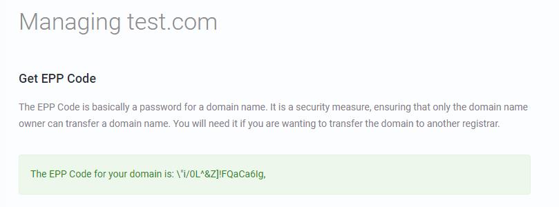 To transfer out your domain, go to the Manage Domain page. Go to the Manage section and click Get EPP Code button.